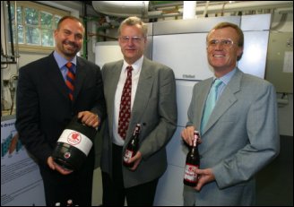 Düsseldorf, 21. August 2002 - In einem besonders attraktiven Objekt hat ein Vaillant Brennstoffzellen-Heizgerät (BZH) jetzt den Testbetrieb aufgenommen: In der Düsseldorfer Traditionsbrauerei "Im Füchschen" erzeugt diese wegweisende Technologie seit Anfang Juli dieses Jahres Heizwärme für Büro- und Wohnräume sowie warmes Wasser und Strom für den Brauprozess und für Reinigungszwecke. Gemeinsam mit den Stadtwerken Düsseldorf wurde das "Füchschen" als Feldtestobjekt ausgewählt und für die Installation und den Betrieb des BZHs umfassend vorbereitet. Peter König, Inhaber der Brauerei, Dr. Michel Brosset, Geschäftsführer der Vaillant Hepworth Gruppe, und Karl Otto Abt, Technischer Vorstand der Stadtwerke Düsseldorf AG, erläuterten heute Ziele und aktuellen Stand des Feldtests.
