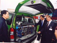 Beijing, 22. April 2002 - US-Handelsminister Donald Evans hat heute während einer China-Reise ein Brennstoffzellenauto getestet. Der auf Basis eines Buick GL8 gebaute "Phoenix" wurde von einem Entwicklungs-joint venture von General Motors Corp. in China entwickelt.